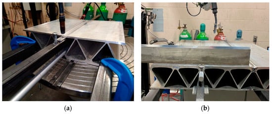 (a) Welding of the bottom skin of the extrusions; (b) top skin deformation measurements.