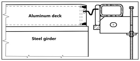 Various features from the three previous projects were merged into an innovative structural concept presented in Figure 9. To respect the confidentiality aspect of the specific project, a generic layout of the structural arrangement, which could be applicable to multiple situations, is presented in this paper. The upper part of the structure is a deck composed of transverse aluminium extrusions welded together by FSW. The lower part consists of a web and a lower flange assembled by GMAW. The whole forms a fully prefabricated composite-effect aluminium structure. The guardrail is bolted to the deck using the bolting plate technique presented previously. An epoxy-aggregate layer is used as an anti-skid wearing surface.
