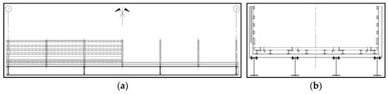 (a) Lateral elevation of the aluminium girder bridge; (b) cross-section of the bridge.