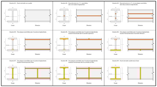 A main difference between the calculation of steel and aluminium girders is the requirement for the latter to calculate elastic and plastic effective section properties based on welding and slenderness effects. A calculation tool based on a parametric section using three segments for each flange and six segments for the web was developed. The tool available through the Alu-Compétences’ platform explicitly details the bending and shear resistance for the nine scenarios presented in Figure 8 [14].