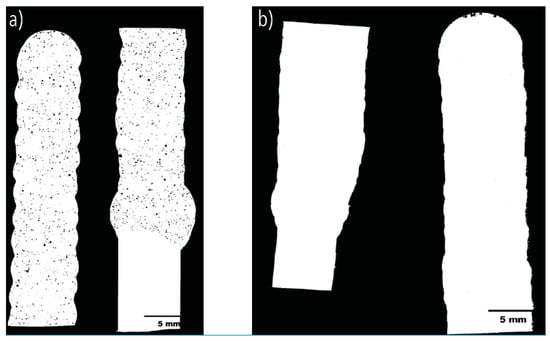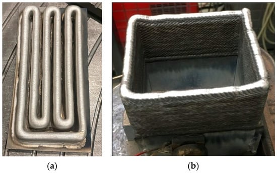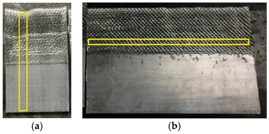 Figure 1b). The thickness of the base plates forming the square is 10 mm, and the deposit has an average width of 11 mm. After printing, different heat treatments were performed. A complete T6 heat treatment was carried out by first heating the part at 530 °C for 2 h (solution heat treatment (SHT)) followed by water quenching and aging for 8 h at 175 °C, while for the “only aged” treatment, the parts were aged for 8 h at 175 °C with no prior SHT. Some aluminium 6061 samples were also hot-isostatically pressed at 103 MPa before the complete T6 heat treatment.