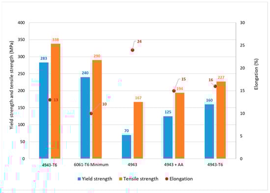 Aluminium alloy 4943 is a filler material similar to 4043 but with a higher percentage of magnesium, which makes it more responsive to heat treatment. After welding, its properties can be improved through ageing. It is typically used to weld 6xxx parts, so the artificial ageing treatment is similar to that used for these alloys. In this work, some samples were only aged for 8 h at 175 °C (artificially aged (AA)), while others were solution-treated at 530 °C for 2 h and water-quenched before ageing (T6). Tensile tests were performed according to the ASTM E8 standard [