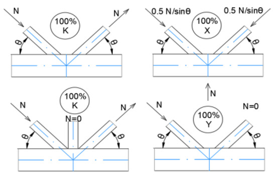 Directly welded joints for structural components are classified according to their shape, such as planar X-, T-, Y-, N-, and K-joints, as well as special KT-, DK-, and DY-joints, and spatial XX-, TT-, and KK-joints [3]. The distribution of forces inside the joint determines the configuration of a welded joint, which includes the joint form, gap (+g), overlap (=−g), eccentricity (e), and angle of inclination of the brace member [11]. Figure 1 shows examples of K-, Y-, and X-joint types that illustrate the aforementioned properties.