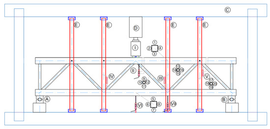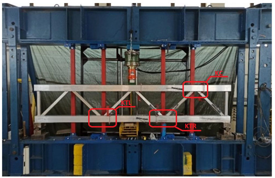 The local deflection of chord members’ faces was measured using displacement transducers that were fixed to them. As shown in Figure 3 and Figure 4, displacement transducers attached to chord members (III, IV, and V) measured local deflections for K-joints, while displacement transducers attached to the steel frame (VI and VII) measured the global deflection of the lattice girders. Meanwhile, the displacement transducer II measured the X-joint’s local displacement.