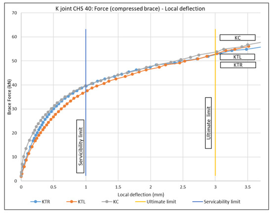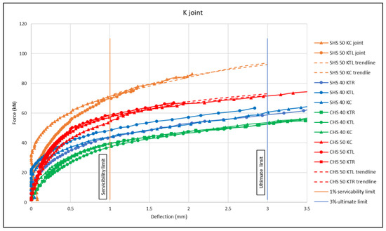 As shown in Figure 5, there was a good match between the load-bearing capacity results for K-joints of the same lattice girder. Because of its low utilization of the chord members’ cross-section load-bearing capacity, the influence of axial force inside the chord members on the load-bearing capacity of the K-joints could be neglected. In the following chart (Figure 6), force–deflection curves for the K-joints of all investigated lattice girders are presented.