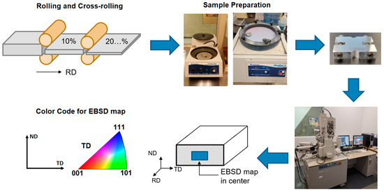 For examining texture and microstructure evolution under electron backscatter diffraction (EBSD) analysis, samples were cut from the center of the deformed metal and cold-mounted. Figure 1 illustrates the step-by-step process of acquiring orientation maps through the EBSD test. The metallographic samples were cold-mounted using resin epoxy and then ground using silicon carbide grinding paper with varying grades (240/480/600/800/1200) to achieve a smooth surface. Ultrasound cleaners were employed to remove any debris remaining on the sample surfaces after grinding. The samples were further polished using diamond particle solutions with particle sizes of 9, 3, and 1 µm. In order to obtain an optimal surface quality for EBSD characterization and enhance the indexation, vibrational polishing was conducted for 3 h using 0.05 µm diamond particle solutions. The prepared specimens were subjected to EBSD testing using a Hitachi SU-70 field emission gun scanning electron microscope. The analysis focused on the central area of the specimen, with the RD positioned perpendicular to the surface, i.e., the EBSD testing was performed on sections along the ND and TD. The ATEX software [11] was used to analyze the EBSD data and generate various representations such as the EBSD map, Pole Figure (PF), and the Inverse Pole Figure (IPF). Figure 1 also displays the color code and the designated TD-ND section used for all EBSD maps.