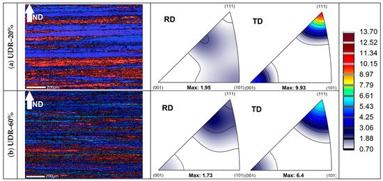 In the UDR condition, upon rolling with a 20% reduction, there were no significant changes observed in the microstructure, and the double fiber texture remained intact, as depicted in Figure 3a. However, with a further increase in reduction up to 60%, the thickness of the layers decreased, leading to the appearance of new color variations, indicating deviations from the initial orientation (see Figure 3b). In certain regions, the red color representing the <001> fiber faded, and new orientations increased. The IPFs also reveal a decrease in the intensities of [111]||TD and [001]||TD orientations with increasing rolling reductions, reaching values of 6.4 × R and 2.21 × R at a 60% reduction, respectively. Additionally, it is evident that a new orientation emerged in the rolling direction ([111]||RD) with increasing reductions [101]||RD orientations diminished as rolling is conducted in the transverse direction.