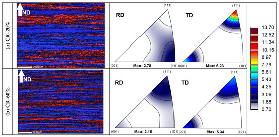 EBSD map and IPF of CR sample: (a) after 20% reduction, and (b) after 60% reduction.