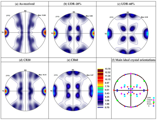 PFs in different conditions: (a) As-received condition, (b) UDR after 20% reduction, (c) UDR after 60% reduction, (d) CR after 20% reduction, and (e) CR after 60%, and (f) Main ideal crystal orientation.