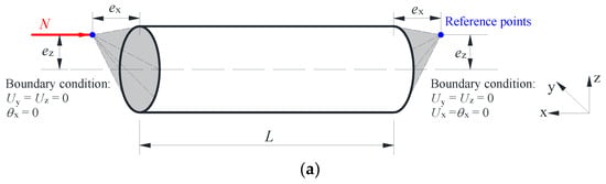 The measured dimensions, strain–stress relationships, and geometric imperfections were incorporated into the ABAQUS models. Note that the residual stresses in extruded aluminum sections may be disregarded [2]. Therefore, only the influence of initial geometric imperfections was taken into account. A rigid body boundary condition corresponding to a thick end plate was adopted in the numerical models. At one end, the compression load was applied at a reference point, which was coupled to the end section through rigid body conditions, while the longitudinal displacement Ux of the opposite reference point was prevented, as shown in Figure 1a. For the short beam-columns results reported in [17], all members were loaded concentrically through cylindrical roller supports, which allowed bending rotation around y-y axis but restrained torsional twist in the end sections. The distance between each roller end and end-section (ex) was 135.4 mm. Note that in the subsequent parametric studies conducted on the specimens subjected to pure bending, a nodal force M was applied at reference points (see Figure 1b) to create a constant bending moment.
