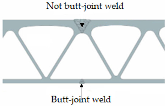Ever since aluminium began to be used on bridge decking, metal inert gas (MIG) welding has been the main technique used to join together the extrusions making up the bridge deck [5]. This fusion welding technique, known for many decades, has been proven to significantly weaken the aluminium in the vicinity of the weld, known as the heat-affected zone (HAZ) [6]. In addition, it is not always possible for the extruded aluminium beams to be butt-welded together, as shown in Figure 1, which, according to many design codes, is the best type of weld in terms of fatigue performance [7]. To circumvent these flaws, designers need to create substantially wider and deeper welding joints, resulting in heavier decks, thicker welds prone to stress concentrations, and a significant build-up of residual welding stresses in the structures, leading to geometrical imperfections, which in turn do not allow a flat deck to be obtained [8].