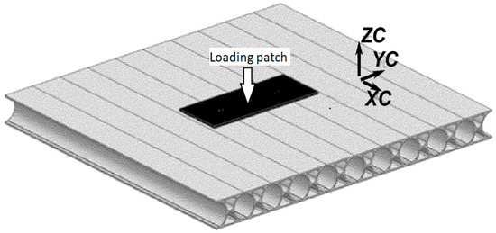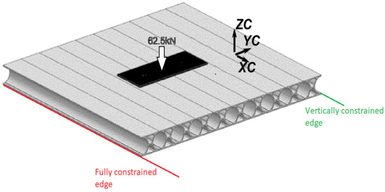 The models to be analyzed were meshed with hexahedral quadratic solid elements, and the appropriate boundary conditions were applied, as illustrated in Figure 8, where one lower edge of the last extrusion of the panel is fully restrained while the opposite lower edge is only vertically restrained and free in all other directions. A gluing contact interaction was set between the extrusions that form a deck and between the loading patch and the deck. The loading patch material is rubber with a minimum thickness of 5 mm to avoid any local stiffening of the loaded area.