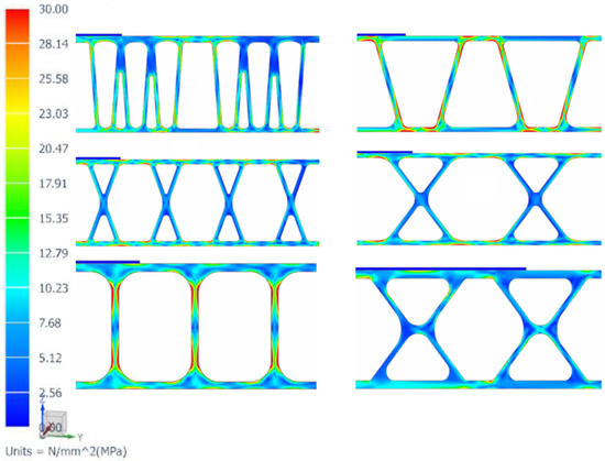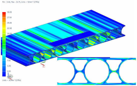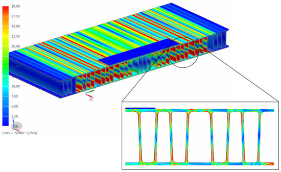 Figure 9 presents the von Mises stress of one of the several extrusion profiles used to design the optimal deck panel extrusion. The von Mises stress scale is set from 0 to 30 MPa. The value of 30 MPa is slightly above 29.02 MPa, which is the fatigue limit for an MIG-welded butt joint. We can observe many red zones where the von Mises stress is higher than the maximum value of 30 MPa.