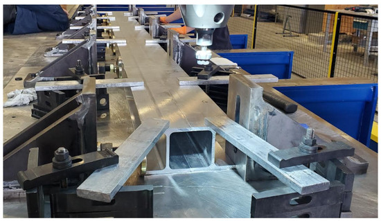 Instead of extruding the profile presented in this article, a more economical approach was preferred to test the weldability and fatigue performances of a BTFSW butt joint weld. In this regard, the upper and lower 8 mm thick flanges of two 6005-T6 H-beams were welded together using BTFSW, as shown in Figure 15. These H-beam profiles were chosen given the geometrical similarity they provide with the butt joint welds of extrusion geometry of this article. Samples from the welding joint were taken and tested in the laboratory both in fatigue and in static loading. The results were published in [18]. These show beyond any doubt that the fatigue resistance of this type of weld greatly exceeds the values prescribed by the CHBDC. Note also that the 2025 version of the CHBDC plans to add a new category of details for butt joints welded using FSW.