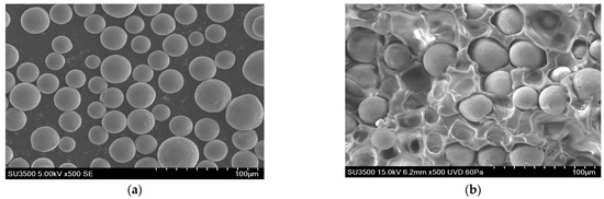 A particular requirement of high-performance feedstock filaments is that the powder particles must be properly distributed and dispersed throughout the filament [5]. Figure 1a depicts the morphology of the virgin AlSi10Mg powder. As shown, the particles are highly spherical. Figure 1b depicts the AlSi10Mg particles embedded in the plasticized–PLA matrix. As shown, the powder particles are well dispersed in the polymeric matrix. An interface between the surface of aluminum particles and the polymeric matrix can be visualized, which could help in the adhesion between printed layers. However, voids within metal particles and the polymer can also be observed.