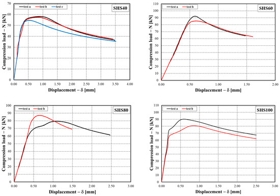The axial displacements have been measured by three inductive transducers (LDT). The mean value of the three measures was considered. Almost all the specimens have failed due to pure local buckling, except the tests referring to SHS100 (test a, test b) and SHS80 (test a) where the instability phenomenon occurred, preliminarily, of a single plate due to the geometrical imperfections of sections and as can also be depicted by observing the shapes of curves provided in Figure 4. The results are shown in Table 4, where the specimen height , the ultimate resistance its non-dimensional value , the maximum displacement , and its non-dimensional value are provided. The non-dimensional values are expressed as: