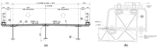 Detail drawings: (a) section view of bridge structure; (b) detail view of barrier anchoring system [1].