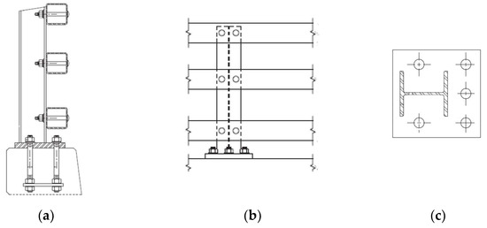 MTQ 210A steel barrier: (a) profile view; (b) front view; (c) anchorage detail [2].