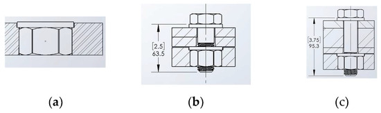 The 7/8″ (22 mm) bolt diameter had two bolt lengths: 3.75″ (95 mm) and 2.5″ (64 mm), as shown in Figure 5b,c.