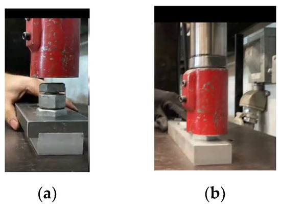 A 10 t press was chosen. The nuts were pressed using a jig to guide them in the first stage, as shown in Figure 7a. In order to have the upper surface of the nut at the same level as the washer seat, as shown in Figure 5a, in the second stage, the nut was pressed directly, as shown in Figure 7b.