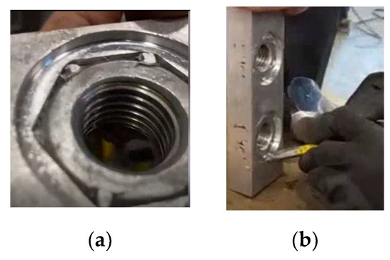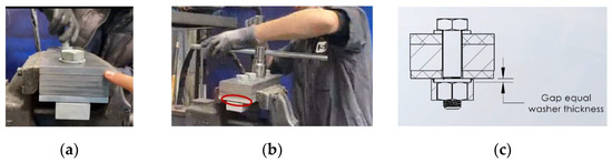 In both cases, two washers were used, the first on the bolt head side and the second on the nut side. In order to have the same project conditions on the test, the materials (6061-T6 for aluminum and 300 W for steel parts) and the thickness of the parts were respected, as shown in Figure 5b,c.