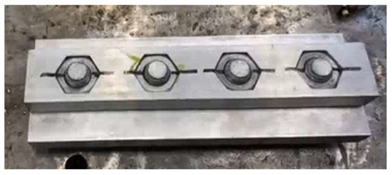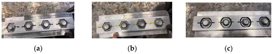 The third operation is to mark the bolt head for both positions relative to the upper part before and after the final tightening, as shown in Figure 10a. To observe the result of the test, the nut position should be marked to the relatively lower part. That determines if the nut slipped, as shown in Figure 10b.