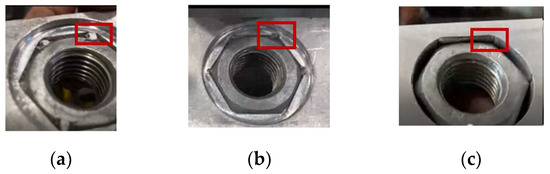 The last operation performed is the visual inspection on the nuts side to observe eventual nut rotation, which can affect the final value of the torque, as shown in Figure 12. Additionally, the flat bar is inspected to observe any side deformations or cracks in order to prove that the dimensions, height, and width are correctly chosen for the bolt plate.