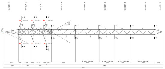 The lower part of the tower, which is the focus of the design, corresponds to six separate modules that are assembled on-site. This study examines various load cases based on wind velocity and ice thickness. The design load cases are based on the IEC 60826 (International Electrotechnical Commission) standard, with wind and ice being the main loads. One of the load cases is shown as an example in Table 1. Point loads are presented in red in Figure 1. Table 2 provides comprehensive information on the magnitude of both gravity and transverse wind loads acting upon the sections/modules of the tower. For this preliminary analysis, wind and gravity loads on the tower are not updated. It is assumed that the mass of the top part of the tower remains unchanged. In addition, updating wind and gravity loads on the top part of the mast (Section 4, Figure 1), which is the critical part in the optimization process, has a negligible effect on the design of these sections.