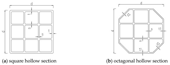 For our OHS, the walls that are directly linked to stiffeners are intentionally designed to have a larger thickness compared to the angled sides of the structure (see Figure 4b). This strategic variation in wall thickness serves a specific purpose. By reinforcing the walls that are connected to stiffeners, the overall structural integrity and bending strength of the octagonal section are significantly enhanced.
