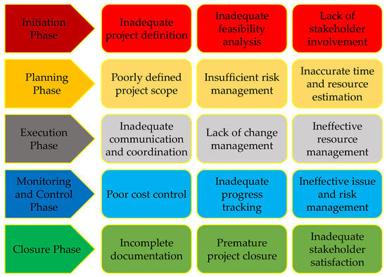 Project management involves distinct project lifecycle phases and challenges, as shown in Figure 1. Unclear initiation objectives and scope lead to stakeholder misalignment [2]. Inadequate feasibility assessment causes unrealistic goals and resource shortages [2]. Planning scope creep increases costs and delays [1]. Underestimating project duration and resource needs results in conflicts [1]. Proactive planning, communication, stakeholder engagement, risk management, and continuous monitoring are crucial for project success.