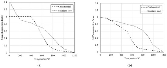 Retention of mechanical properties for stainless steel (SS) and carbon steel (CS) including (a) strength; (b) stiffness (adapted from Ref. [3]).