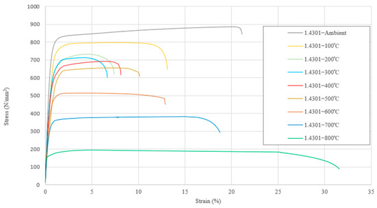 Stress-strain responses for grade 1.4301 at elevated temperatures adapted from Ref. [4].