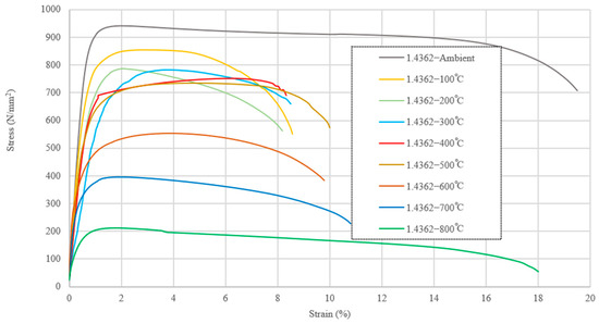 Stress–strain responses for grade 1.4362 at elevated temperature adapted from Ref. [4].