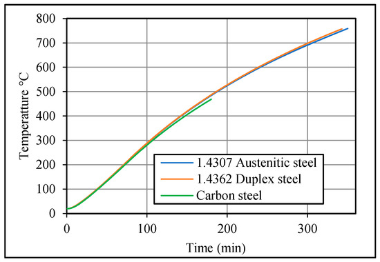 The validated numerical model was employed for the simulation of SSRC beams under fire. The only difference in the model is the material model for the reinforcement. The interaction between the rebar and the concrete is modeled as a perfect bond in both cases; however, the tensile stiffening modeled for concrete allows for modeling the effect of interaction in a simple manner [10]. In the current study, stress–strain curves measured in practical tests for both austenitic (1.4301) steel and duplex (1.4362) steel at elevated temperatures were used in the numerical model to determine the fire resistance of SSRC beams under fire. There was a wide difference in the thermal expansion of CS and SS rebars, but it did not result in any changes in the heat distribution between the concrete and rebars (Figure 4).