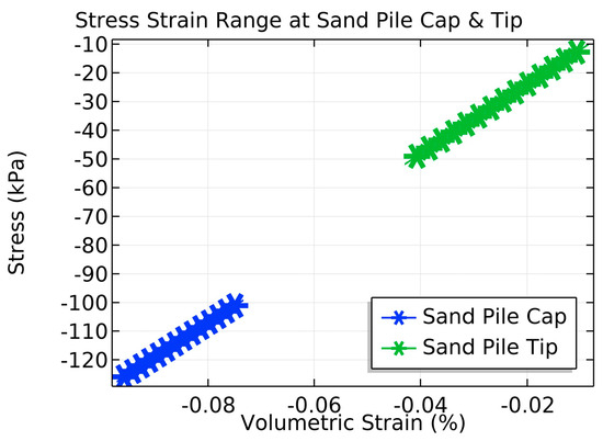 The stress–strain range at the cap and tip of the pile is shown in Figure 3. The analysis’s findings show the pile’s ability to support loads and its distortion. The volumetric strain gauges the volume change in the soil surrounding the pile. The pile’s cap and tip’s negative values for volumetric strain indicate soil compression around the pile; the volumetric strain is more significant at the pile cap than the pile tip.