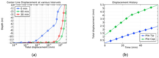 Consolidation effects of the sand pile system. (a) Depth (m) vs. displacement (mm), (b) Displacement history.