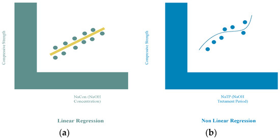 The general representation of linear and non-linear regression is represented in Figure 1. With the help of the input parameters, i.e., NaTP, NaCon, CR%, w/c, water, sand, and gravel, the equation was developed for the MLR model in an Excel data sheet for forecasting and results extraction for the dependent variable. The equation developed for the prediction of NaOH-pre-treated crumb rubber is shown in Equation (4).