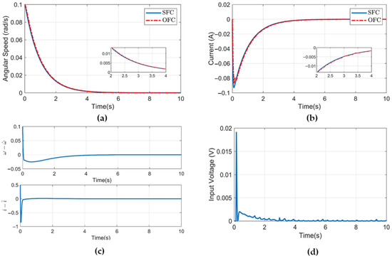 (a) Angular speed of the PMDC under SFC and OFC. (b) Armature current under SFC and OFC. (c) Estimation error of the estimated states with measured states. (d) Input voltage under OFC.