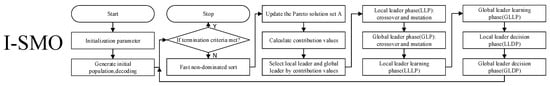 The SMO algorithm, introduced by Bansal et al. in 2014, is a novel swarm intelligence optimization algorithm that simulates the splitting and merging behavior of spider monkeys during their foraging process []. Mumtaz et al. proposed a new hybrid spider monkey optimization (HSMO) algorithm for PCB assembly scheduling problem []. In this study, the SMO algorithm is discretized using the crossover and mutation operations from the GA. Furthermore, the contribution value method is employed to select the global leader and local leaders. The I-SMO algorithm process is shown in Figure 1.