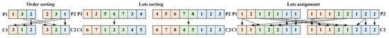 During the LLP stage, members of each group will update their position by approaching their respective local leaders, while during the GLP stage, all members will update their position by approaching the global leader. Cross operation is divided into three layers: (1) Crossing the processing order by using the two-point crossing method. (2) According to the order sorting, the lots sorting is obtained; (3) For lots assignment, the partially matched crossover method, similar to the two-point cross method, is used to cross each process in order. An example of crossover is shown in Figure 2.