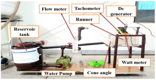Figure 1 shows a view of the manufactured experimental apparatus. Four parameters were selected for the investigation of their effects on the torque generation. The parameters include flow rate, cone angle, blade position, and blade type. The experiments were conducted at three flow rates (35 LPM, 45 LPM, and 45LPM), three cone angles (25°, 40°, and 55°), three blade positions (P1, P2, and P3) and three blade types (B1, B2, and B3). Water was circulated using a 0.50 horsepower water pump manufactured by Super Aisa, Pakistan, and the flow rates were set using the globe valve. The flowrates were measured in liters per minute (LPM) using a panel mound-type flowmeter (manufactured by Dwyer) and has a minimum capacity of 10 LPM and a maximum capacity of 90 LPM. Three different blades runners were fabricated using acrylic material. The blades were designed in such a way that they yielded the best results in terms of torque generation. In this experiment, a mini non-contact tachometer (Lutron DT-2234) and DC generator were installed to measure the torque. A Deek-Robot Wattmeter (0 to 500 watts) was also installed in the experimental setup to measure the power.