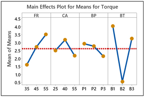 Taguchi analysis was used to improve the process parameters listed in Table 1 in order to identify the factor that has the greatest impact on torque generation. Additionally, Taguchi analysis was performed to forecast the ideal combination of the chosen elements, and then the confirmatory test was utilized to verify the findings. The results of the response with respect to the approach are summarized in Table 2.