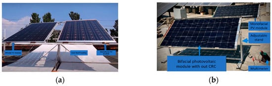 Figure 1 shows the experimental setup with CRC (a) and without CRC (b). The experimental setup consisted of a TiO2 cool roof coating covering the ground, mPV, bPV, and an adjustable stand. Photovoltaic modules were installed on the roof of MED UET Taxila, Pakistan (33.7° N, 72.8° E latitude angle). The tilt angle of the PV module was kept at almost 34°. Solar irradiance, temperature, and photovoltaic module output were measured by using a pyrometer, laser thermometer and digital multimeter, respectively.