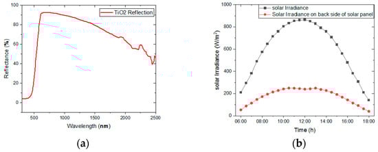 Spectral reflection of the TiO2 coating (a) and solar irradiance on the front and back surface of the PV module (b).