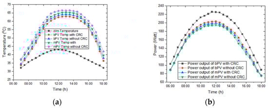 The temperature of photovoltaic modules with and without the cool roof coating is illustrated in Figure 3a. It is observed that the temperatures of the photovoltaic modules with the cool roof coating are lower those of the photovoltaic modules without the cool roof coating. The maximum temperature for the monofacial photovoltaic module without CRC is 66.5 °C at 13:30. The monofacial photovoltaic module with CRC, the bifacial photovoltaic module without CRC, and the bifacial photovoltaic module have temperatures of 65.2 °C, 63.9 °C, and 62.7 °C, respectively. The temperature of bifacial photovoltaic module is lower than that of the monofacial photovoltaic module, due to the transparency of bifacial photovoltaic module. The highest peak power is produced by the bifacial photovoltaic module with the cool roof coating, with an efficiency of 18.09%, as shown in Figure 3b.