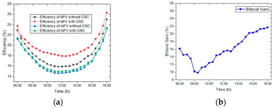 The peak power of the bifacial photovoltaic module is enhanced by 3.29% with the usage of the cool roof coating, as shown in Figure 4a. The bifacial photovoltaic module also outperforms the monofacial photovoltaic module with and without the cool roof coating, by 5.28% and 5.52%, respectively. The efficiency of the bifacial photovoltaic module is more than that of the monofacial photovoltaic module because of the rear irradiance and the lower module temperature due to the transparency of the bifacial photovoltaic module. The bifacial gain of the bifacial photovoltaic module is shown in Figure 4b. The bifacial gain measured at peak power is 15.6%. The highest bifacial increase was 21.68% in the evening.