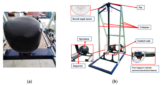 where ET is the total energy, Eh is the energy absorbed by the specimen, K·Eh is the kinetic energy of the helmet after impact, and Erec is the recoil/remaining energy of the impactor after the collision. The total energy of the impactor was calculated through the maximum kinetic energy achieved by the impactor just before impact. The potential energy of the impactor depended on the height achieved by the impactor measured by measuring the angle of inclination on the protractor attached. The kinetic energy of the helmet was measured through the total distance covered by the helmet on a steel rail, measured using a ruler. The frictional force was responsible for stopping the helmet. The higher the kinetic energy, the higher the distance traveled, as the friction force was assumed to be constant. The following Equations (4) and (5) were utilized to calculate the kinetic energy of the helmet.