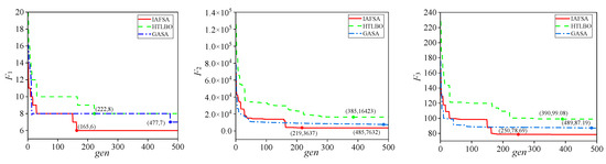 The three algorithms were executed five times for an equal duration to evaluate the effectiveness of the algorithms and assess the convergence and distribution of the Pareto solutions. This allowed us to determine the non-dominance rate (NR) and generation distance (GD) metrics. As given in Table 1, in the five runs, the NR metrics of the IAFSA were larger than those of the HTLBO and GASA algorithms, and the GD metrics were smaller than those of the other two comparison algorithms. In summary, the NR and GD metrics verify that the IAFSA algorithm is superior in terms of solution diversity and convergence.