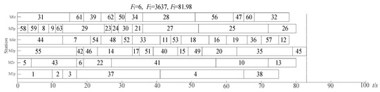 From Figure 1, it can be seen that for F1, the value obtained via the IAFSA algorithm is 6, the GASA algorithm is 7 and the HTLBO algorthim is 8; for objective F2, the three algorithms converge at the 219th, the 385th and the 485th generations, respectively; for F3, the IAFSA algorithm converges to 78.69 at the 250th generation and the HTLBO converges to 99.08 at the 390th generation; the GASA algorithm converges to 87.19 at the 489th generation. Thus, the convergence speed and the convergence results of each optimization objective for the proposed IAFSA algorithm are all better than the other two comparison algorithms. Figure 2 shows the Gantt chart of the disassembly task sequence for a solution in the Pareto solution set solved by the IAFSA algorithm.