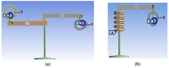 The connections between the ground and camshaft, as well as the rocker arms, allow for rotational movement, while the connection between the valve and ground enables linear motion. A rotational velocity of 1 rad/s is used to simulate the camshaft’s rotation. Similarly, the traditional valve train mechanism also assumes frictionless contact regions and employs revolute joints between the ground, camshaft, and rocker arm. The spring is supported at the bottom and connected to the valve at the upper end.